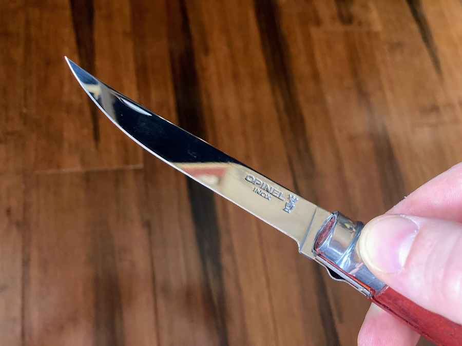 In place of the clip point blade you’ll find on a classic Opinel, the Slim Series has a trailing point blade; the spine is straight along most of its length, but arcs gently upward at the tip. Again, it’s well-designed for its intended purpose. The blade comes to an exceptionally fine point, which is good for piercing.