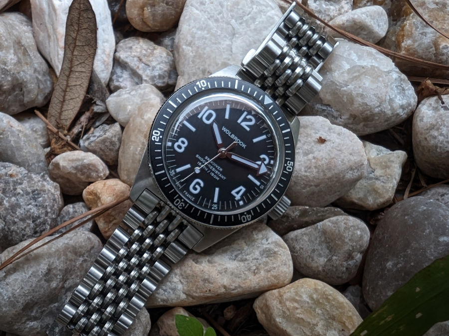 Wolbrook is a revived heritage brand known for its military and tool watches from the mid-twentieth century. The Skindiver Automatic comes in a 40 millimeter stainless steel case with a domed sapphire crystal, 150 meters of water resistance, and a Miyota automatic movement offering a 60 hour power reserve.