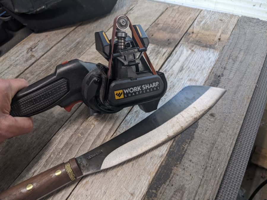 A dremel is a handheld power tool with a rotating sharpener at the end. It looks a bit like an electric screwdriver. Getting an even grind on a machete with a Dremel is quite tricky, and requires skill and concentration. It’s a better option for removing small isolated dull spots and imperfections rather than sharpening an entire blade.