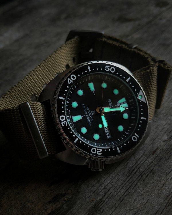 A flat sapphire crystal with anti reflective coating handles scratches, the crown and case back screw down for a proper two hundred meters of water resistance, and the dial is all business with high contrast numerals, a 24 hour track, and serious lume on the hands, plots, and markers. Inside is the ever reliable Seiko NH35 with hacking and hand winding.