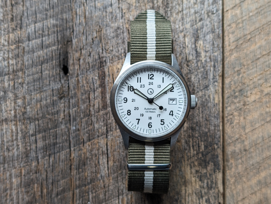 I reviewed the Ocean Vintage in depth here, and it’s truly a stellar watch! If you want a robust watch that can do the rough stuff, then consider this guy. It comes on a great bracelet that can be easily swapped to a nato strap for a more official field watch look.