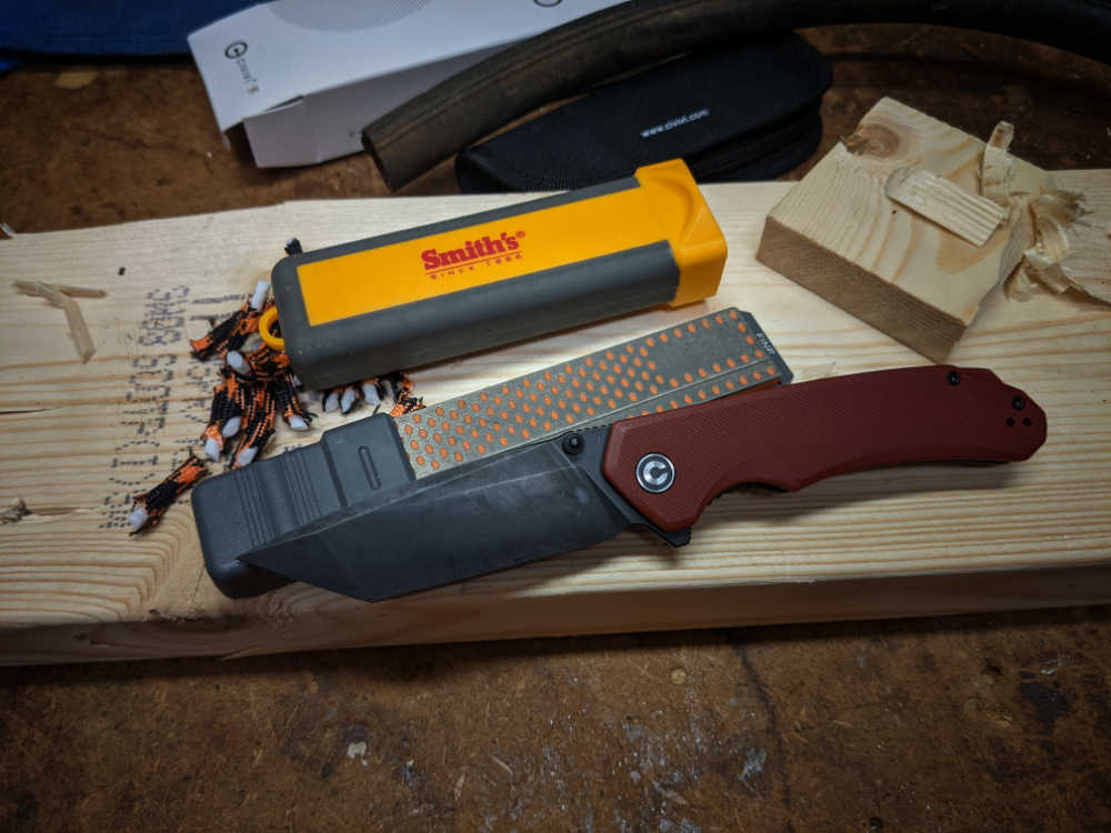 The knife didn’t make it through a normal Saturday morning of chores without needing to be sharpened again. After cleaning the garage, breaking down a bunch of boxes, cutting out old carpet from my son’s truck and cutting it so it would fit in the trash, then cutting twine for tomato plants, the blade was very dull. I have other D2 blades that have shown better performance, most notably my OKC Rat2.