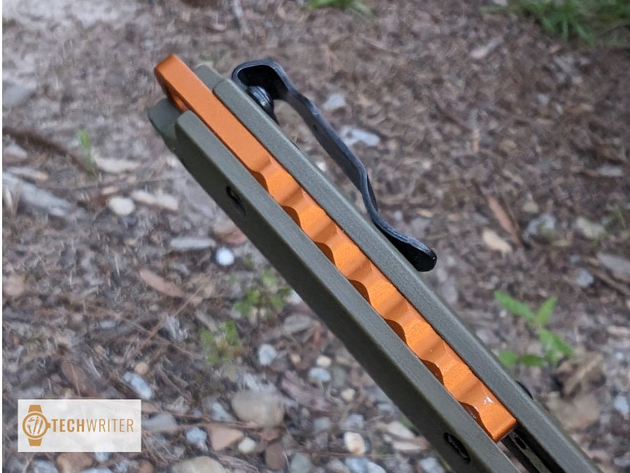 Right out of the box, the Taggedout feels like a bigger, clip-point cousin of the Bugout. If you’ve owned the Bugout or the Crooked River, you’ll recognize the DNA here instantly. OD green G-10 scales, orange anodized aluminum backspacer, and a long, thin clip-point blade. It looks cool — very “Benchmade tactical.” The Axis Lock is as fidget-friendly as ever and came smooth and perfectly centered.