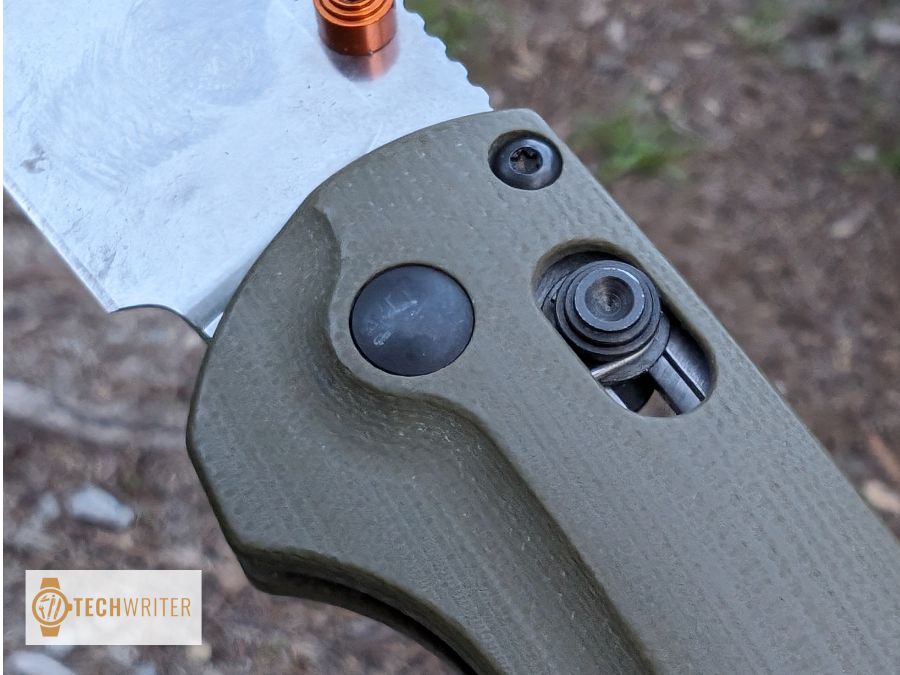 My version of the Taggedout still has the elliptical thumb hole — not the upgraded thumb stud version Benchmade recently released. And honestly? It looks good but functions like a second-thought design.