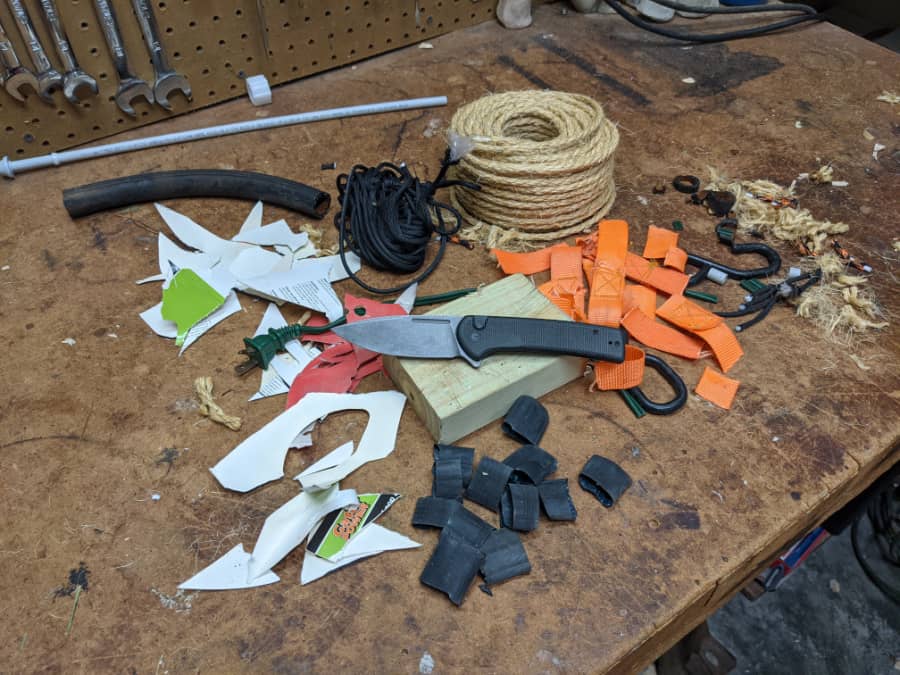 If we’re testing a knife, for example, we’ll put it through its paces cutting through wood, rope, rubber hosing, cardboard, plastic milk jugs, and pretty much anything else we can think of. If we’re testing a hatchet, we’ll split logs, chop down trees, and put up a target and see how well it throws. If we’re testing a machete, we’re gonna clear some acreage baby.