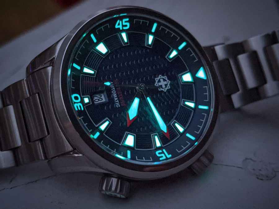 The markers, batons, hands and inner rotating bezel all have a healthy dose of Swiss SuperLuminova BGW9. This guy really lights up the darkness. Another nice touch with the lume is that the logo and marker on the crowns are also lume-filled. The time setting crown has the Second Hour logo while the bezel-locking crown has a triangle marker letting you know the position of the crown from being opened or locked down.