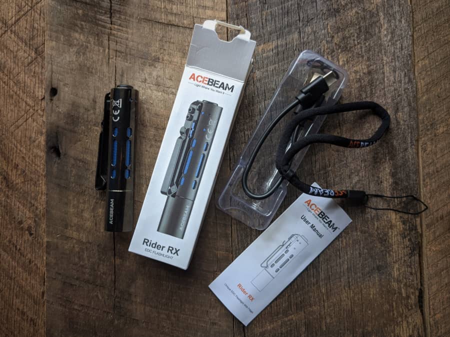 The box the Acebeam Rider RX flashlight comes in is handsome and minimalist, with a nice matte finish and some basic information printed on it. Inside you’ll find the flashlight (with a rechargeable Lithium-ion AA battery already installed) along with a lanyard, a couple of spare o-rings, a minimalist instruction booklet, and a short USB charging cable (no brick, just the cable).