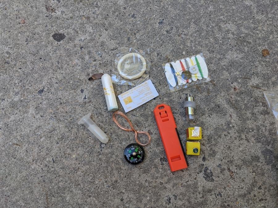 The sewing kit contains one needle, two buttons, one one safety pin, and 6 different colors of thread (not sure how long the threads are). It’s pretty basic, but would be handy for a variety of repairs in a survival situation.