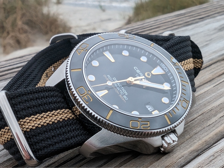 I swapped to a fabric strap because that’s just how I prefer to wear my dive watches, but the stock bracelet is solid. Nothing fancy, but secure, comfortable, and practical. The gilt accents on the dial pop beautifully in the sun that warm gold against the matte black dial just hits right. And the lume? Legitimately strong. It glows bright blue, lasts for hours, and stays evenly lit.