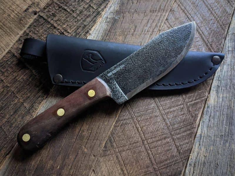 The walnut wood handle is held to the blade’s full tang with three brass pins. The blade is made of 1075 high carbon steel, and has the Condor Classic finish, which the folks at condor describe as being created using “hand powered equipment” to give the appearance of a hand-forged blade.