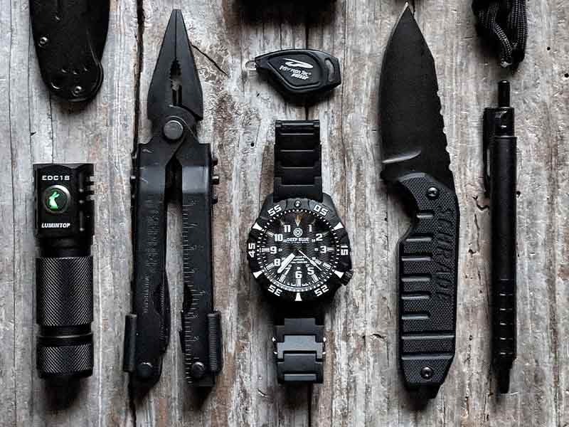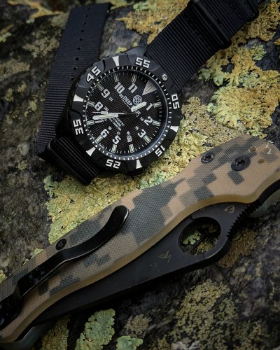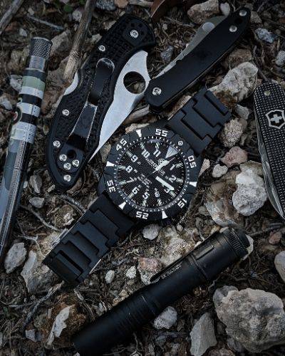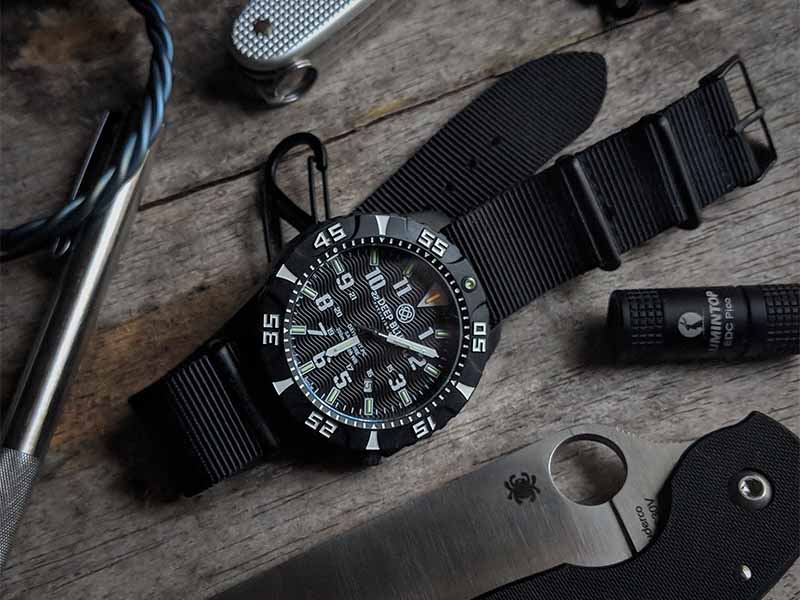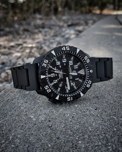 It’s light on the wrist, the lume is utterly outstanding, and it’s good-looking! If you like a tactical, adventure-looking watch, then this is for you. The black on black case is well done, and the white markings on the dial really stand out.