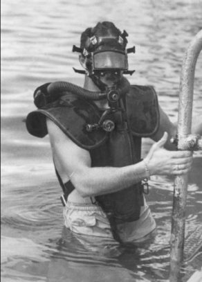 During this time, movie stars Buster Crabbe (more about him later) and Johnny Weissmuller frequented the sports shop. The two were involved with the first dive using the regulators but they didn’t work. Rene was furious and wanted to send the regulators back, but a friend, Glen McCall, said by making some adjustments he could make them work. McCall was correct and the next dive was successful.