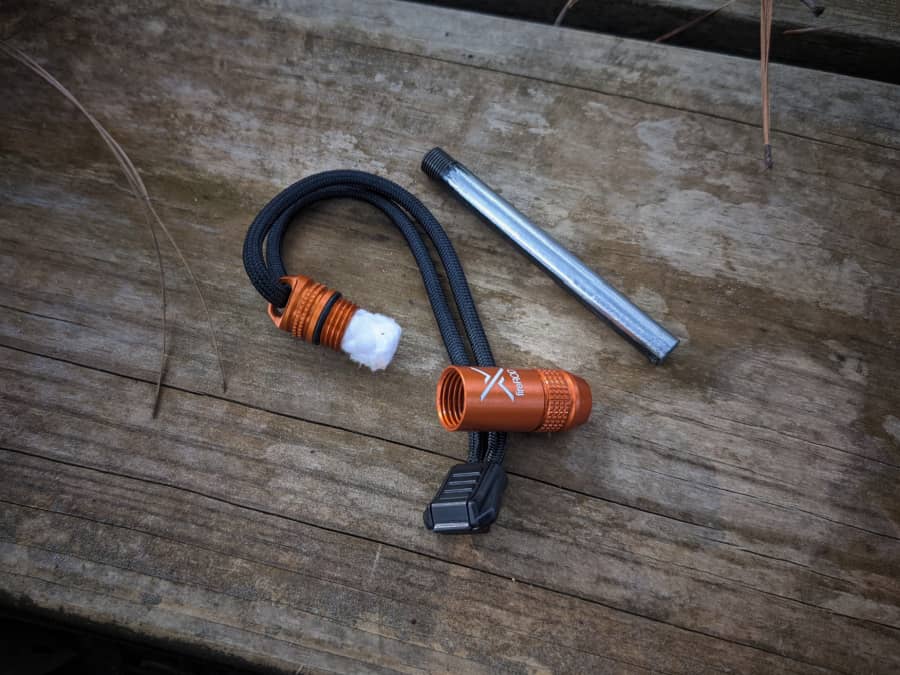 The FireROD also comes with a couple of Exotac quickLIGHT cotton tinder knots stuffed into the handle, and they light beautifully with a spark from the ferro rod. The attached lanyard can also serve as tinder in a pinch.