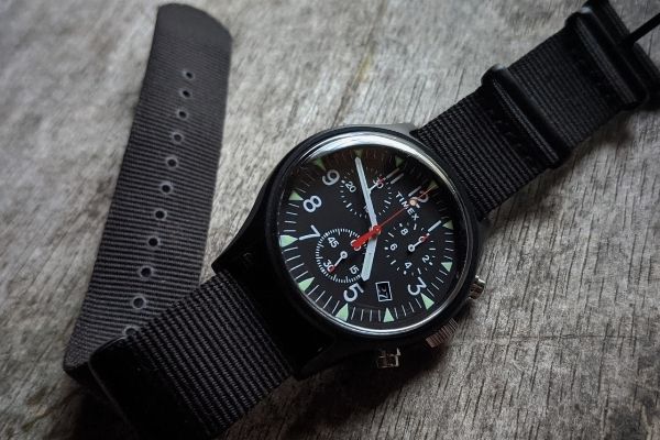 First and foremost, it incorporates Timex’s trademark Indiglo function (more on that later) and features an aluminum case, stainless steel back and acrylic crystal. Today’s MK1 chronograph is also a quartz watch.