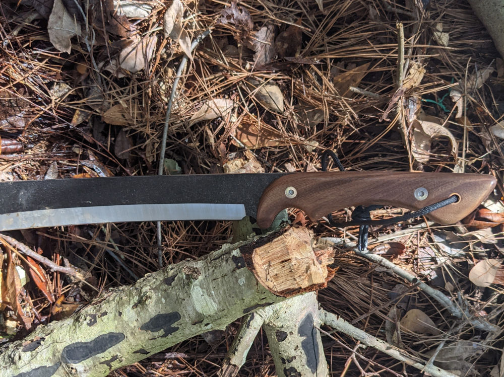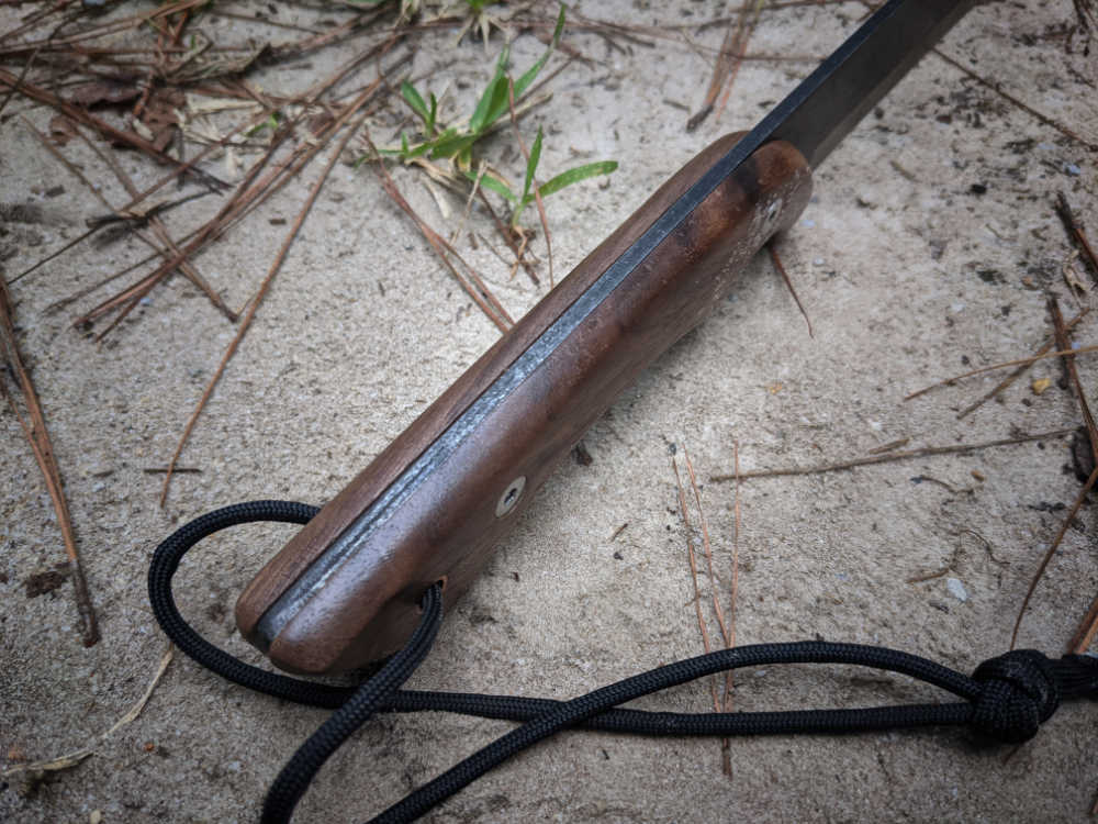 Both of my boys loved it and actually used the sharpened flat tip in multiple ways, such as cutting out roots and scraping away vines. I was impressed with the overall usability and how it performed. We chopped, sliced, hacked, and even batoned a few pieces of firewood and it never complained or showed any weakness. Under heavy use there is some slight blade flex, but nothing out of the ordinary. What surprised me the most is that the walnut scales never loosened up after all that chopping.