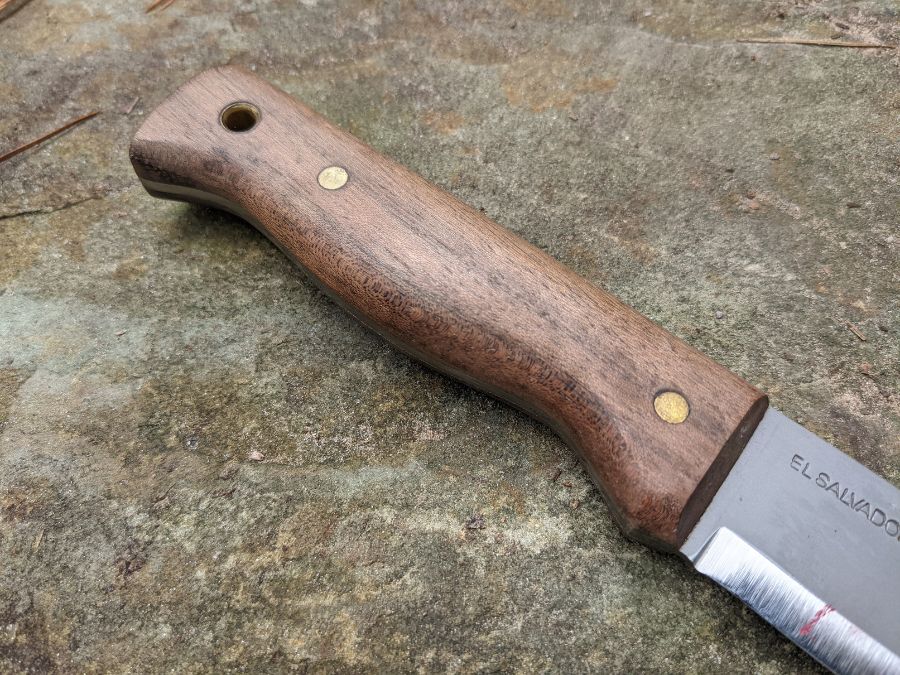 The walnut scales are held in place by flush brass rivets. The handle also features a lanyard hole reinforced with a brass ring.