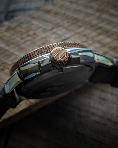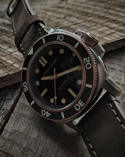 The dial is where the good looks start: the brown sunburst is a beautiful shade and the indices and hands play off the deep, rich color. Unlike many of the Spinnaker models that have a cool textured dial, they decided on the Hull Diver to go with a smooth dial with sunburst.