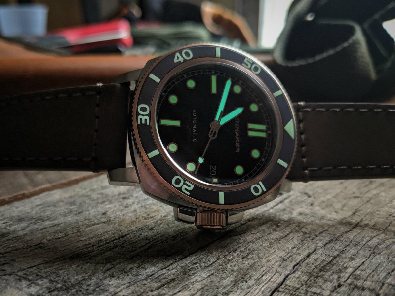 The ceramic bezel insert is also a deep brown and the markings are all lumed. As I mentioned above, the lume is awesome. I am not sure at the time of this review about the exact makeup of lume, but Spinnaker usually applies a healthy dose of Super Luminova and it looks like that’s the case here.